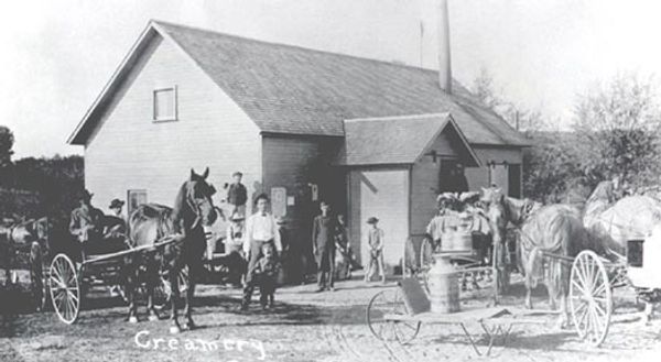As the Germania dam was built, the Colony members also dug a “ditch” parallel to the Mecan River, in order to provide a controlled water flow for powering a grist mill situated near the junction of CTH N and Eagle Road. The mill burned in 1899, and one of the millstones was subsequently recovered and delivered to the Marquette County Historical Society in Westfield. The Germania creamery was later built just south of the original mill location, and part of that building still remains standing. Another long-standing Germania landmark, the Germania general store, owned at one point by F. W. Matz, was situated on the southwest corner of the intersection.